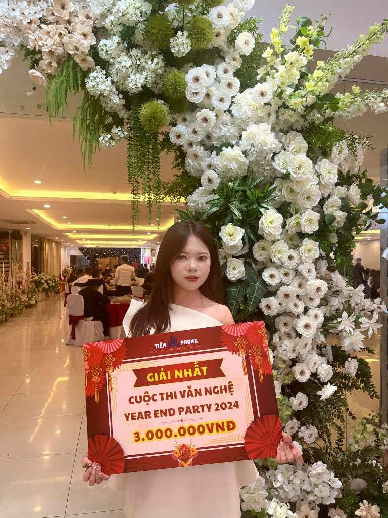 Hình ảnh Ngọc Lan rạng rỡ khi giành giải Nhất cuộc thi văn nghệ tại do Công ty TNHH Đầu tư và Môi giới Bất động sản Tiên Phong tổ chức.