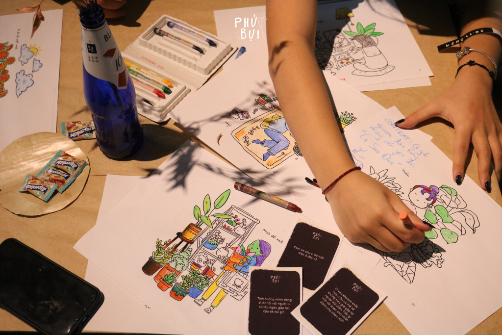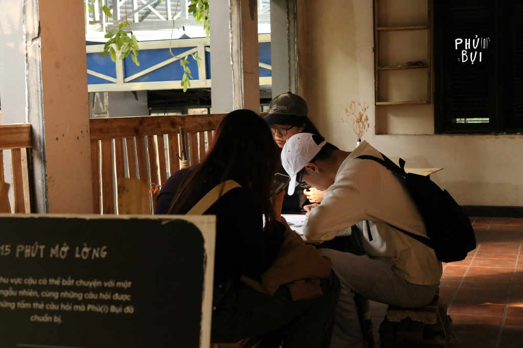 Bên cạnh đó, người tham quan được tham gia hoạt động tương tác 1-1 ngẫu nhiên mang tên “15 phút thật lòng”. Trong không gian riêng tư với ba gian phòng ngăn cách bằng vải, hai người chơi sẽ lần lượt trả lời những câu hỏi từ bộ bài, xoay quanh bản thân và các mối quan hệ trong vòng 15 phút.