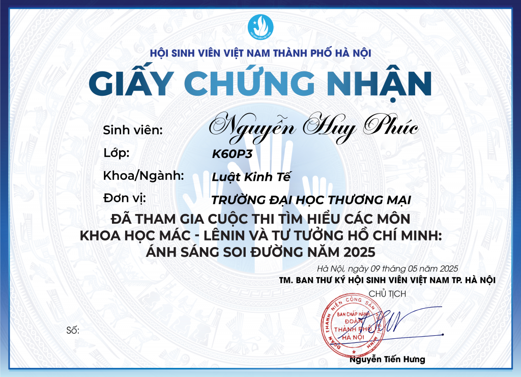 Chàng trai Nguyễn Huy Phúc, sinh năm 2006, hiện đang là sinh viên năm nhất tại Trường Đại học Thương mại. Ngay từ năm đầu đại học, Phúc đã thể hiện một tinh thần năng nổ và trách nhiệm đáng ngưỡng mộ khi đảm nhiệm nhiều vai trò quan trọng: Bí thư lớp học phần, Cộng tác viên tại Hội Sinh viên Thành phố Hà Nội (Thành Đoàn Hà Nội), Học viên lớp MC Chuyên nghiệp K45 tại ST Lighthouse, đồng thời tham gia và hoạt động tích cực trong 4 câu lạc bộ trong và ngoài trường.