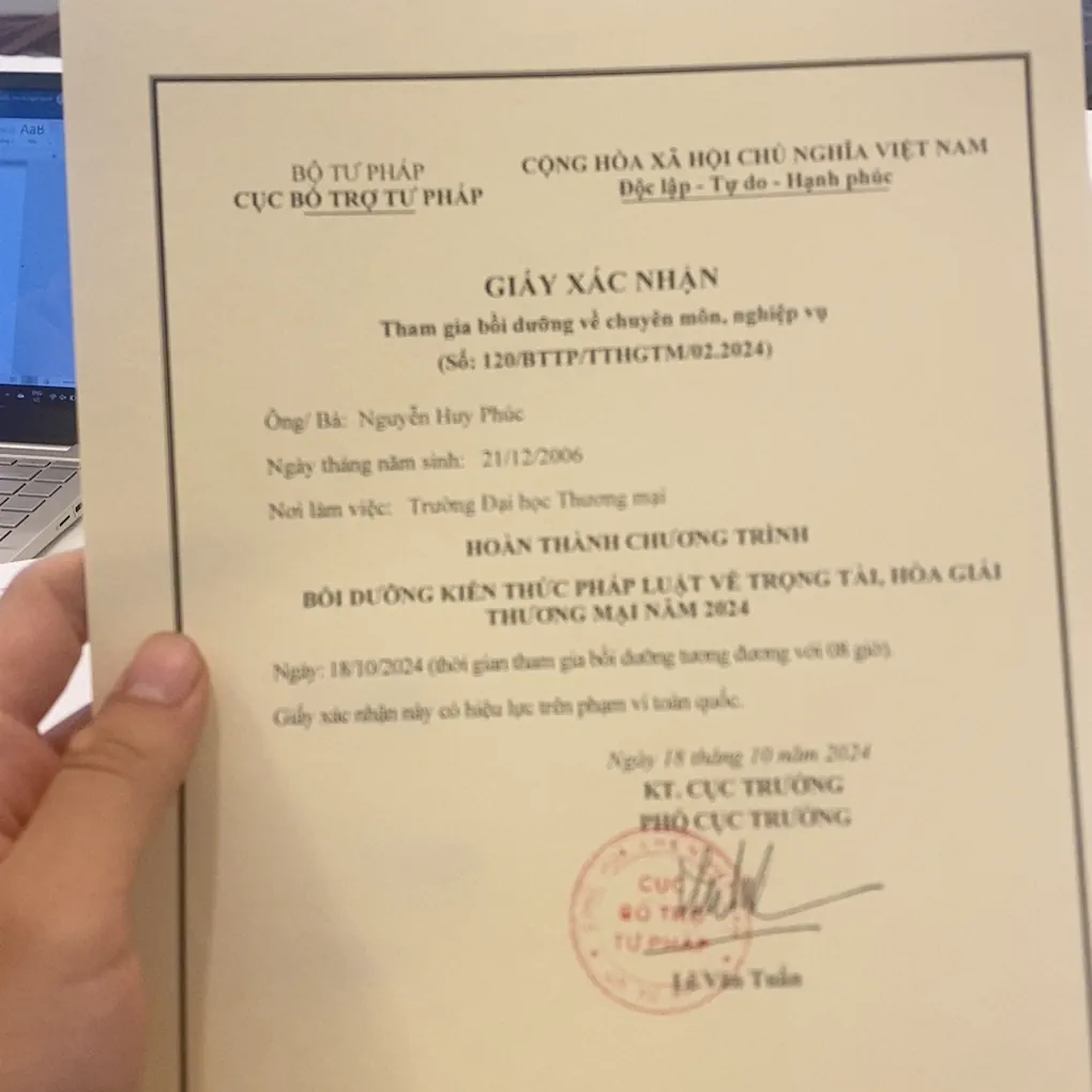 Giấy xác nhận hoàn thành khóa tập huấn “Kiến thức pháp luật và kỹ năng hòa giải thương mại” của Huy Phúc