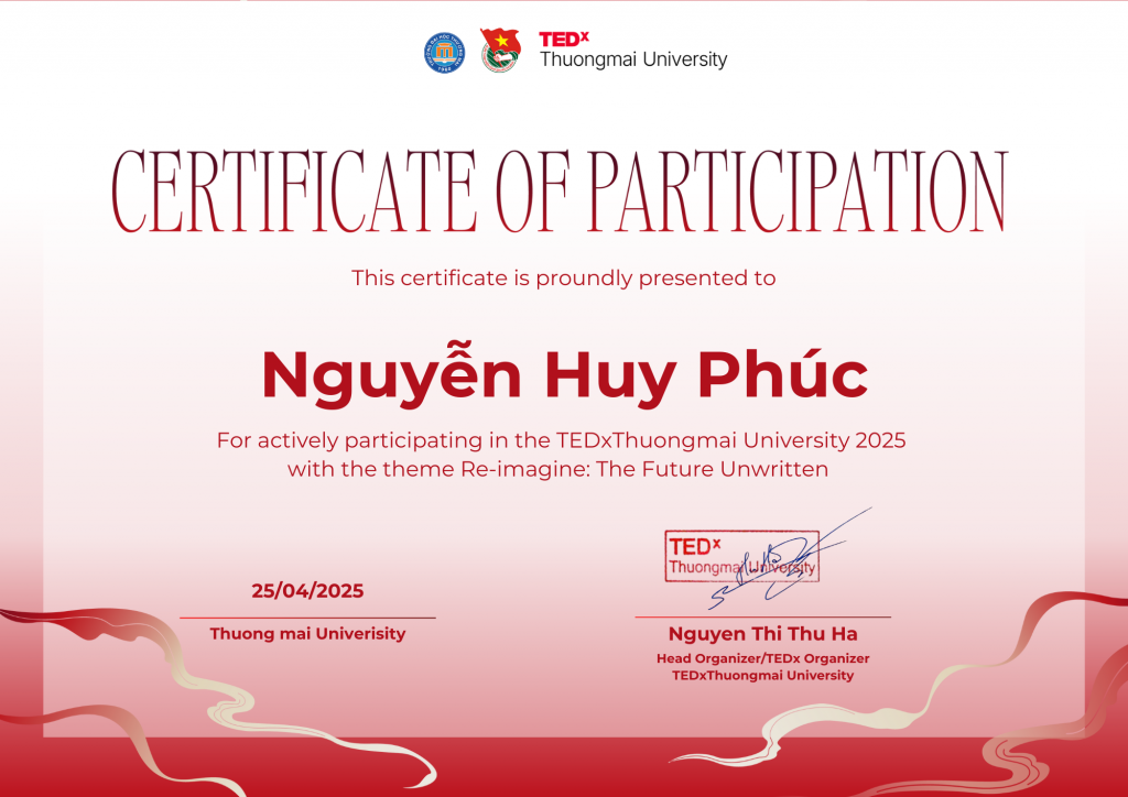 Nguyễn Huy Phúc đang sống những tháng năm rực rỡ của tuổi trẻ – dấn thân, không ngại thử thách và luôn chủ động trong mọi lựa chọn. Với tinh thần cầu tiến, lòng đam mê mãnh liệt và định hướng rõ ràng, tin rằng Phúc sẽ tiếp tục tạo nên nhiều dấu ấn mới trên con đường học tập, nghề nghiệp và cống hiến cho xã hội.
