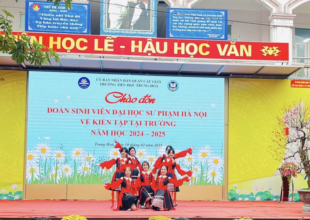 Nguyễn Kiều Nhi cùng các bạn sinh viên Đại học Sư phạm Hà Nội biểu diễn tiết mục văn nghệ chào mừng tại Trường Tiểu học Trung Hòa trong đợt kiến tập năm học 2024–2025.