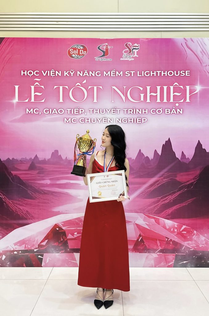 “Lúc mới bước vào lớp MC, mình thật sự choáng ngợp. Mọi người nói quá giỏi, quá tự tin. Mình từng nghi ngờ bản thân rất nhiều. Nhưng rồi mình tự nhủ phải cố gắng từng ngày. Danh hiệu là phần thưởng, nhưng điều quý nhất là mình đã vượt qua được nỗi sợ và sự tự ti của chính mình.”